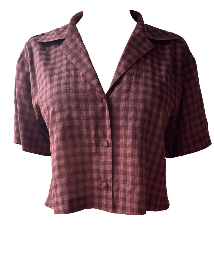 Camisa cropped manga curta com gola esporte e botões forrados no mesmo tecido.